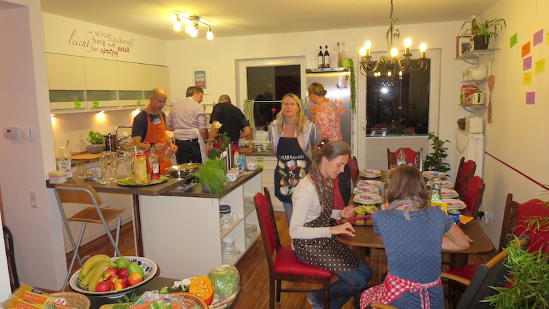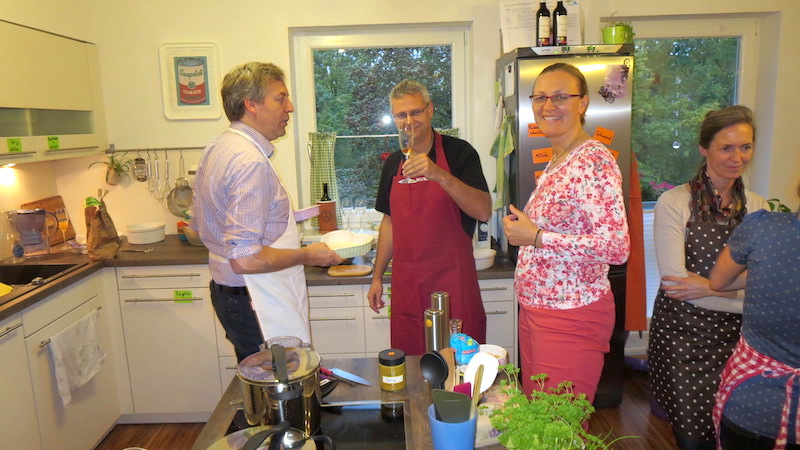 „Eine offene, sehr freundliche Atmosphäre bei den Coaches zu Hause, wo ich mich bereits beim Betreten der Wohnung sehr wohl gefühlt habe. Nach kurzer Theorie-Einführung konnten wir in Zweierteams die liebevoll ausgelegten Zutaten verarbeiten. Das Kochen löste Blockaden, man kam schnell ins Gespräch. Rückzugsmöglichkeiten ermöglichten intime Gespräche ungestört zu führen – die Coaches hatten auch das Essen im Auge, so dass man sich auf die Gespräche konzentrieren konnte. Durch die vorherige Theorie fühlte man sich auch sicher, einander gut zu coachen. Beim gemeinsamen Essen tauschten sich die Teams aus und genossen in angenehmer Atmosphäre die Köstlichkeiten. Eine liebevolle Gastfreundschaft, bei der es an nichts mangelte. Sehr gerne wieder!“